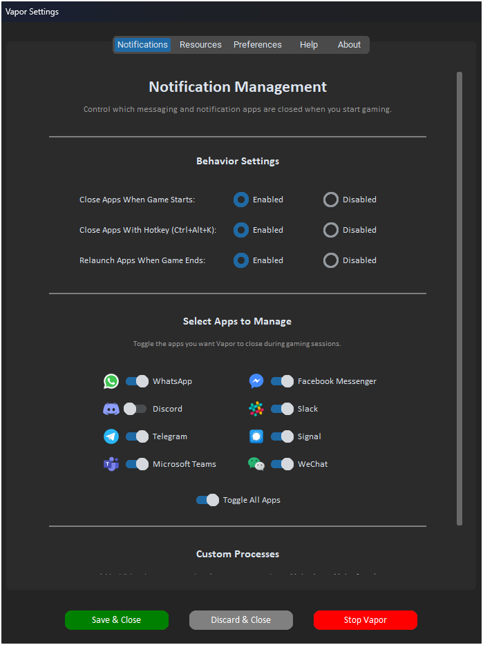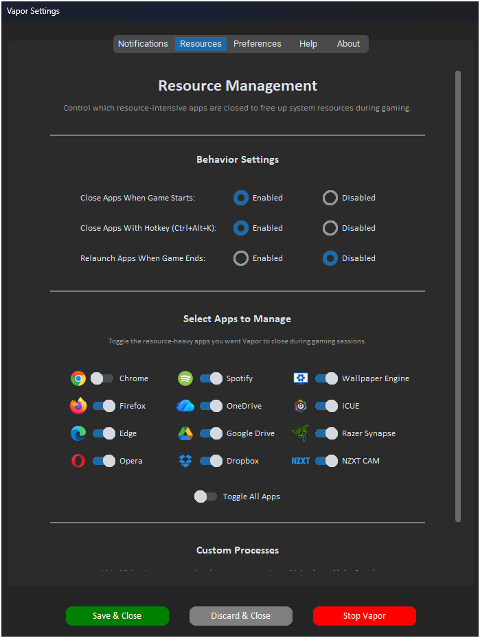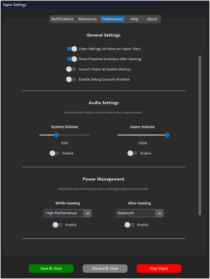 Forget the hassle of manually tweaking volumes, switching power plans, closing and relaunching resource-hungry apps, or toggling Windows Game Mode—Vapor handles it all seamlessly, tailored precisely to your preferences.