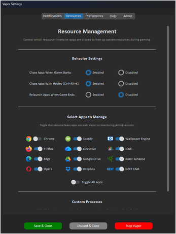 Concerned about apps that "optimize" your system without your input? You're not alone—and Vapor gets it. No one knows your setup better than you, so Vapor only automates the features you explicitly choose, with full transparency and easy customization beyond the defaults. What you select is exactly what it delivers—no surprises, just control. Under the hood, Vapor uses only standard Windows APIs that any productivity or gaming utility uses: reading Steam's public registry key to detect games, managing processes the same way Task Manager does, and adjusting audio and power settings through documented Windows APIs. Everything runs at normal user privilege level—no admin rights required, no kernel drivers, no system hooks.