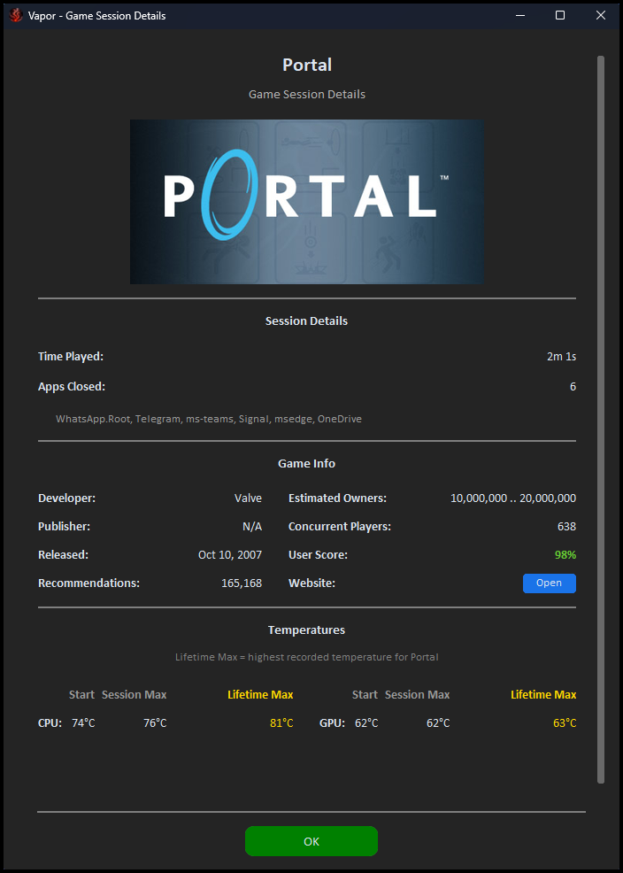 Vapor uses the same standard Windows features available to any app: reading Steam's public registry to detect games, managing processes like Task Manager does, and adjusting audio/power settings through normal Windows interfaces. It runs quietly in your system tray and checks for updates automatically.